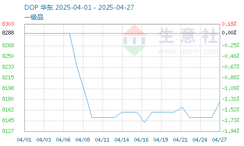 据生意社商品行情分析系统,截止4月27日,DOP价格8175.84元/吨,较4月1日DOP价格8288.75元/吨震荡下跌,跌幅1.36%。增塑剂DOP企业开工率降至5成左右,增塑剂DOP产量下降,异辛醇需求疲软,异辛醇需求支撑减弱,异辛醇下跌压力仍存。
