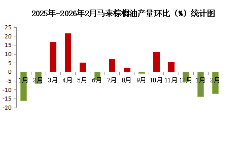 供应面:马来西亚2026年2月1-20日,马来西亚棕榈油产量环比减少12.29%。马来西亚棕榈油出口量为863358吨,比1月同期的947939吨减少8.92%。主产区马来西亚仍处于减产周期,其中,1月棕榈油产量环比下降超12,出口数据同样走低,多空交织,提振棕榈油行情有限。