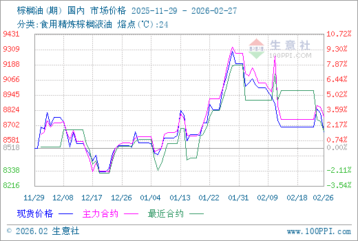 据生意社商品行情分析系统显示:2月棕榈油行情走弱,价格振荡下行,跌幅超5%。月初,棕榈油市场均价9196元/吨,2月27日,棕榈油市场均价8800元/吨,下跌5.76%。