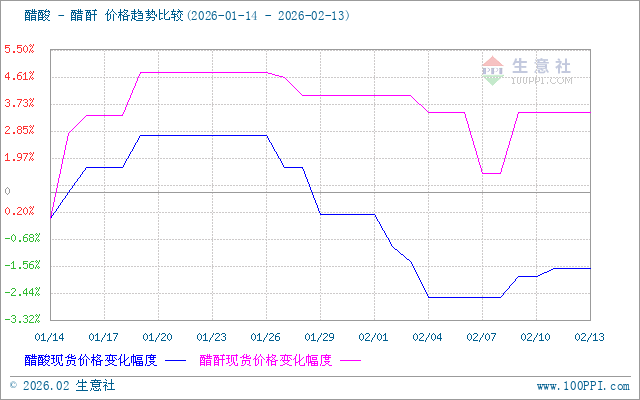 本周(2.9-2.13)国内醋酸价格小幅上调。供应端,醋酸装置开工率窄幅减少,节前企业出货意向浓厚,下游备货逐渐放缓,入市采买刚需跟进,市场交投氛围不一,醋酸企业报价大稳小动,部分持货商成交价上移,周内醋酸市场行情观望整理。