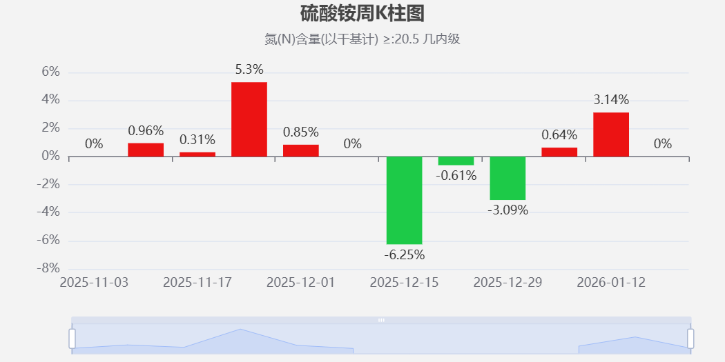 根据2025年11月3日-2026年1月10日周K柱图可以看出,国内硫酸铵周期内涨跌互现。1月国内硫酸铵价格上涨较多,最大涨幅在1月12日当周跌幅为3.14%。