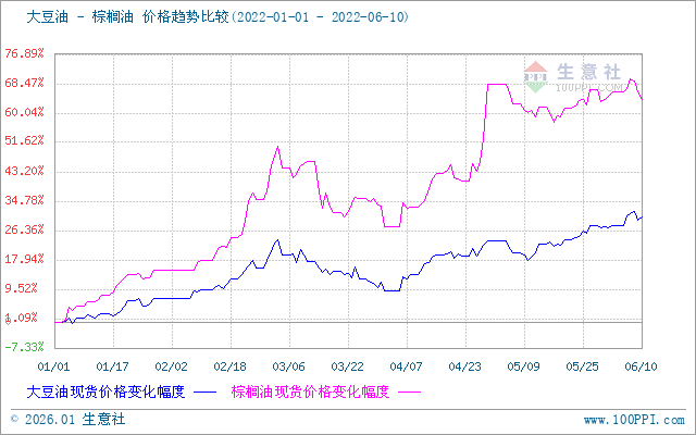 据生意社监测,6月6日山东地区豆油市场均价12560元/吨,6月10日山东地区豆油市场均价12522元/吨,下跌0.3%。6月6日国内棕榈油市场均价15960元/吨,6月10日国内棕榈油市场均价15670元/吨,下跌1.82%。