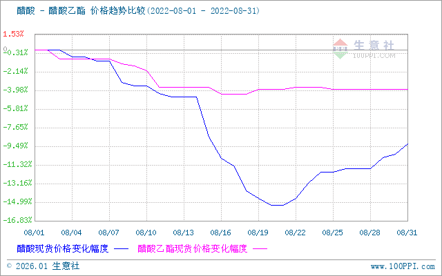 8月醋酸行情延续弱势下行,价格先跌后涨。中上旬醋酸行情延续7月份走势持续下跌,工厂方面,上海华谊、大连恒力装置检修结束,场内货源供应增加,而下游需求持续疲软,入市采买积极性欠佳,市场表现供强需弱,醋酸行情持续下行;下旬国内部分工厂醋酸装置进行不同程度降负,个别企业或停车检修,场内供应量缩减,持货商心态转好,商谈重心上移,醋酸市场触底反弹,但因下游需求有限,醋酸价格区间波动运行。