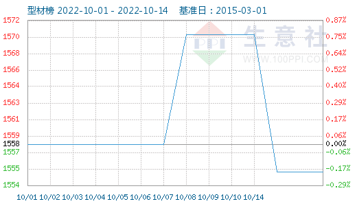 据生意社型材指数显示,本周(10.1-10.14,下同)型材市场主流价格先涨后跌,整体呈窄幅震荡走势。截至14日,生意社型材指数为1555,较节前下跌0.19%,钢坯价格环比节前下跌1.35%,各品种型材价格基本不变,其中角钢、槽钢上涨、工字钢维持不变、H型钢下跌0.58%,具体如上图。本周型材价格趋弱运行,主要在于假期间市场交投停滞,但供应维持,社库、厂库持续累库,导致节后型材去库缓慢,钢材需求释放乏力,叠加钢坯价格下跌,成本端支撑下行,带动成材价格下跌,低价询盘交易居多,贸易商多套利出货。