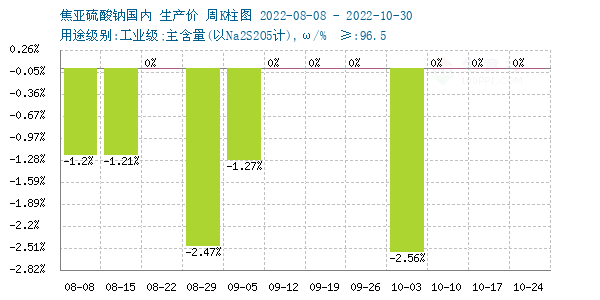 据生意社监测,10月国内焦亚硫酸钠价格弱势趋稳,工业级焦亚硫酸钠10月1日均价2600.00元/吨,10月31日均价2533.33元/吨,月内整体下跌2.56%。