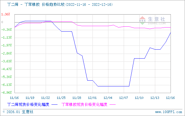 根据生意社监测,国内丁二烯市场行情持续走高,12月9日至16日,国内丁二烯市场价格自6566元/吨上涨至6755元/吨,周期内价格涨幅2.87%,价格环比下跌0.55%,同比上涨40.92%。经过前期消耗,贸易商手中货源较少,恰逢部分下游刚需阶段性补仓,一度拉动现货价格走高。