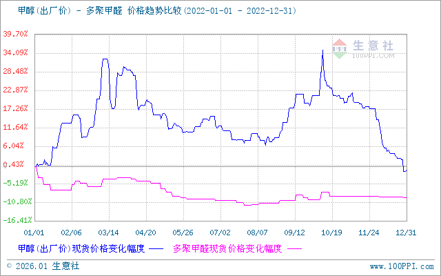 据生意社大宗商品榜数据显示,年初山东多聚甲醛的均价为5966.67元/吨,年末山东多聚甲醛的均价为5400.00元/吨,下跌了9.50%,最高点是年初,最低点是7月31日,最高点相比最低点下跌了11.73%。