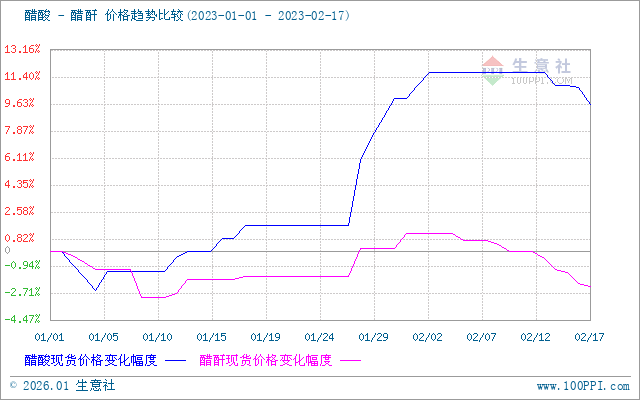 下游醋酐市场整理下行,截止2月17日,醋酐出厂价为5287.50元/吨,与2月11日价格5412.50元/吨相比跌幅2.31%。上游醋酸价格走跌,醋酐成本下降,醋酐下游需求不足,市场商谈氛围疲软,醋酐行情持续下行。