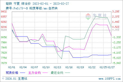 2月硅铁行情持续的下跌,整个市场一直处于低迷态势。前期由于期货盘面下跌,加之原料兰炭价格下调,在众多不利因素条件下,硅铁现货行情持续走低,但在上周,受到内蒙古阿拉善盟一煤业公司露天煤矿发生大面积坍塌事件的影响,原料兰炭止跌回涨,硅铁现货价格小幅回调。根据生意社价格监测,硅铁(牌号:FeSi75~B;粒度等级/mm:自然块)02月27日宁夏地区报价在7800-7900元/吨,均价7804元/吨,较月初跌4.41%。