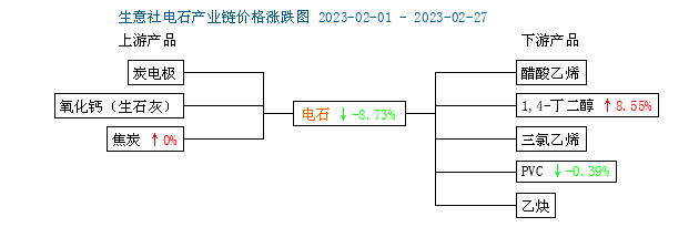 本月电石下游PVC市场价格先跌后涨。本月PVC市场价格先由2月1日的6338.33元/吨下跌至2月8日的6153.33元/吨,跌幅2.92%,低位运行一周,后又上涨至2月23日的6313.33元/吨,涨幅2.60%。月末价格较去年同期同比下跌25.37%。本月1,4丁二醇出厂价格小幅上涨,出厂价格由月初的12928.57元/吨上涨至月末的14033.33元/吨,涨幅8.55%。整体看来,本月电石下游市场行情小幅上涨,下游需求较好。
