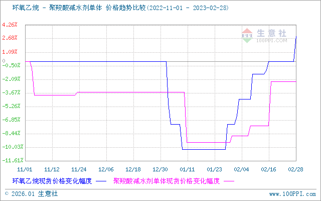1. 终端需求转好,主力下游聚羧酸减水剂单体价格回暖。一方面节后归来,终端房地产复产复工开启,聚羧酸减水剂单体企业生产积极性加大,对环氧乙烷需求有所加大。