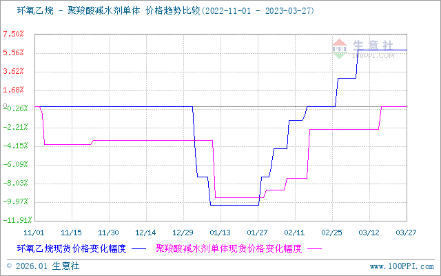 终端需求转好,主力下游聚羧酸减水剂单体价格回暖。一方面节后归来,终端房地产复产复工开启,聚羧酸减水剂单体企业生产积极性加大,对环氧乙烷需求有所加大。