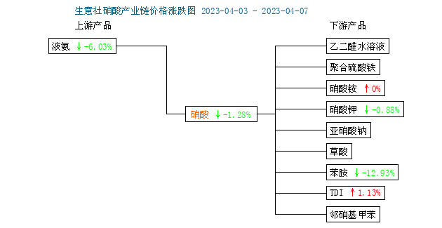 4.03-4.07期间上游液氨下跌6.03%。下游苯胺价格下跌12.93%,TDI价格上涨1.13%,硝酸钾下跌0.89%。原料液氨持续的下行,硝酸市场观望气氛较浓,需关注原料走弱对局部市场坚挺情绪的利空影响,生意社硝酸分析师预计硝酸价格或将以窄幅震荡走势为主。
