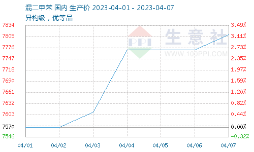 从生意社混二甲苯商品行情分析系统,截止4月7日,混二甲苯价格7810元/吨,较4月1日混二甲苯价格7570元/吨上涨,涨幅3.17%。4月混二甲苯价格震荡上涨,邻二甲苯成本上涨,邻二甲苯上涨动力较大。