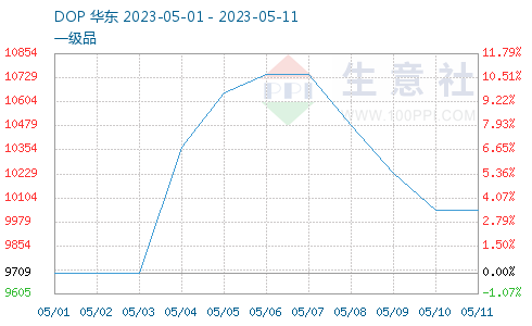 据生意社商品行情分析系统,节后增塑剂产品价格暴涨,本周增塑剂价格高位回落。截止5月11日,DOP价格10041.67元/吨,较5月1日价格9709.17元/吨上涨,涨幅3.42%;较5月6日价格10750元/吨下跌,跌幅6.59%。节后异辛醇和正丁醇价格暴涨,增塑剂节后价格应声大涨,随着异辛醇、正丁醇价格下跌,增塑剂价格高位回落。