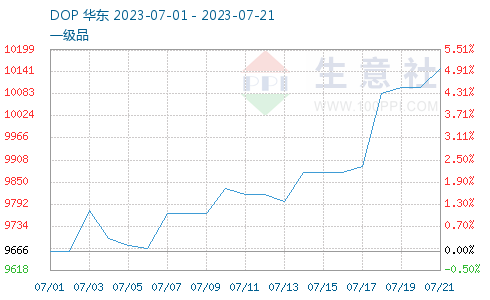 据生意社商品行情分析系统,截止7月21日,DOP价格10100元/吨,较7月1日价格9666.67元/吨上涨,涨幅4.48%。原材料异辛醇价格震荡上涨,增塑剂DOP成本上涨,下游需求回暖,增塑剂上涨支撑加大,增塑剂DOP价格震荡上涨。
