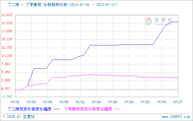 据生意社商品行情分析系统,7月国内丁二烯市场行情单边上行。7月1日至27日,国内丁二烯市场价格自5973元/吨上涨至7201元/吨,周期内价格涨幅20.56%,价格同比下跌26.03%。