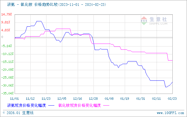 近日(2.8-2.23)液氨市场行情先跌后涨整体下跌,氯化铵成本重心较节前小幅走低。据生意社商品行情分析系统显示,截至2月23日液氨价格在2833元/吨,较8日的2866元/吨下跌了1.16%,周期内低点在2706元/吨。节日期间国内液氨市场价格已经运行到相对底部,山东地区氨价跌至2500元/吨以下,接近成本线。节后,随着下游逐渐开工,采购需求增加。以及运输市场逐渐恢复正常,市场价格陆续抬升。另外,两湖地区有超过50万吨的装置检修,局部供应收紧,更提供了供应面的利好。