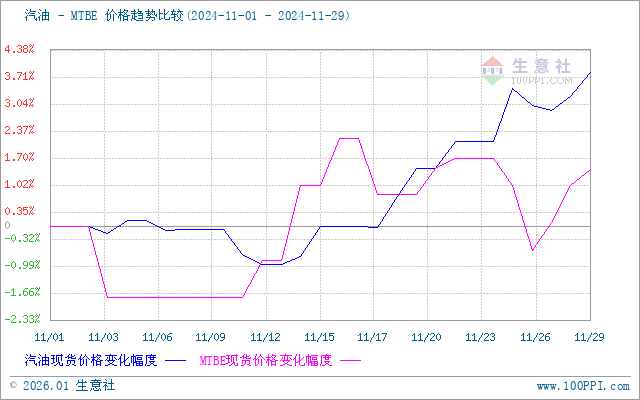 截止11月28日收盘,亚洲MTBE市场收盘价较上一交易日下调4.2美元/吨,FOB新加坡收于691.49-693.49美元/吨。欧洲MTBE市场收盘价较上一交易日下调6美元/吨,FOB ARA收于817.49-817.99美元/吨。适逢感恩节,美国MTBE市场休市。