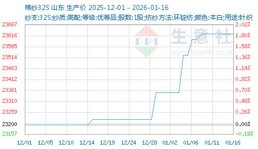 据生意社商品行情分析系统显示:本周上游棉花下跌,纺企出货有所好转,棉纱价格较为稳定。截至1月16日,国内山东地区21S纯棉环锭纺现货价格参考22250元/吨左右,与上周持平;32S纯棉环锭纺现货价格考在23600元/吨左右,与上周持平。