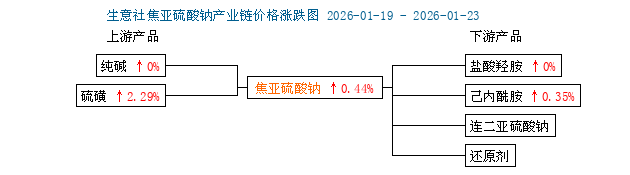 本周国内工业级焦亚硫酸钠(含量96.5%)市场价格上涨,焦亚硫酸钠上游纯碱价格稳定,硫磺价格上涨2.29%,下游己内酰胺价格上涨0.35%,上游原料硫磺长势难止,带动焦亚硫酸钠价格上涨。(以上价格均指国内主流企业对外报价,部分未报企业暂不在其范围内,价格仅供参考,与厂家最终定价无关,详情请联系各厂家咨询)。