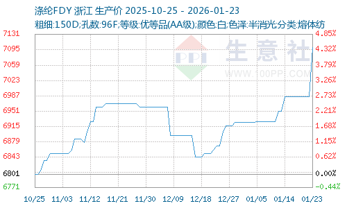 本周(2026.01.16-01.23)涤纶长丝呈先稳后涨、周五加速走势,浙江、福建部分大厂报价上调50-100元/吨,现货成交重心上移,期货带动情绪向好。主流规格POY/FDY/DTY周内累计涨50-100元/吨。截至1月23日,截至1月16日,江浙主流涤纶长丝工厂POY(150D/48F)报价在6750-6830元/吨,涤纶DTY(150D/48F低弹)报价在7900-8100元/吨,涤纶FDY(150D/96F)报价在6980-7050元/吨。