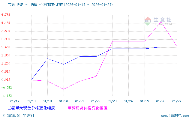 二氯甲烷市场在供应端主动收缩的支撑下,价格重心小幅上移,呈现“稳中走坚”的格局。据生意社商品行情分析系统监测,截至1月27日,山东地区二氯甲烷散水均价报1790元/吨,周期内上涨2.43%。市场的主要驱动逻辑从“需求疲软”逐步转变为“成本支撑与供应收缩”的共同作用。