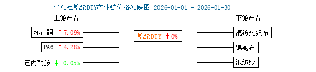 成本方面:2026年1月,锦纶丝上游原料市场整体趋于平稳,未出现大幅波动,对锦纶长丝形成弱稳支撑,但支撑力度有限,难以推动其价格上行。从核心原料己内酰胺来看,本月国内供应充足,头部企业稳定开工,恒申集团、巴陵石化等主力供应商保障稳定供货,国内己内酰胺产能已达680万吨/年,自给率提升至92.5%,有效缓解了进口依赖带来的价格波动风险。价格方面,本月己内酰胺价格小幅震荡后趋于平稳,截止1月30日,生意社己内酰胺基准价为9500元/吨,较月初基本持平。