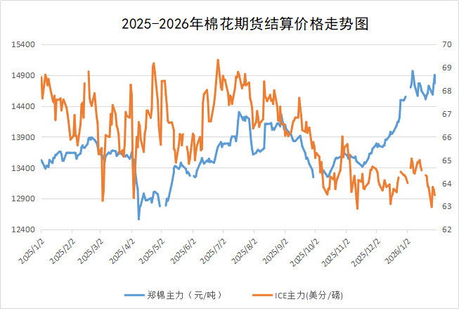 1月ICE期棉主力合约呈现明显的区间震荡格局,受宏观情绪与下游需求制约,上方存在明显阻力。1月来,ICE期棉在63-65美分之间震荡,需求未出现显著回暖,棉价预计仍将维持震荡筑底的格局。