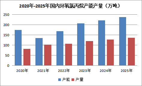 二、2026环氧氯丙烷供应端预测:2025年环氧氯丙烷产能增长速度较快,总产能约达238.5万吨,产量约为137万吨。这一年新增了4套装置,合计新增产能约29.5万吨/年,推动总产能显著攀升。在新增的产能中,甘油法等绿色环保工艺成为主要方向。例如,南山铝业计划在印尼投资建设的项目以及焦煤集团新获批的项目,均采用了甘油法工艺。