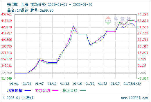 据生意社商品行情分析系统监测:本周(1.26-1.30)华东地区1#锡锭市场先涨后跌,周初市场均价在438600元/吨,截至1月30日市场均价在427370元/吨,跌幅2.56%。