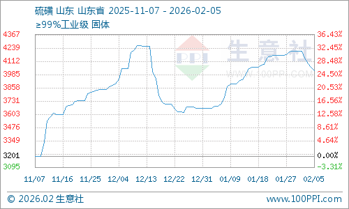 虽然本周价格下行,但需要将其放在更大的背景中来看,此次下跌发生在此前一个月的持续大涨之后。就在1月份,硫磺价格整体走高,月度涨幅明显。目前4053元/吨左右的价格,依然处于生意社统计的“一年高位”区间。这反映出市场的基础支撑仍然牢固。