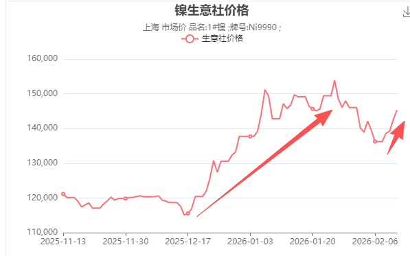 据生意社数据数据显示,截止2026年2月12日,国内电解镍市场均价145300元/吨,较2月8日的136250元/吨,上涨6.64%。