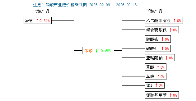 2.09-2.13期间上游液氨价格上涨0.31%,下游苯胺、硝酸钾、硝酸铵、TDI价格均稳定。下游市场染料、军工、染料中间体等刚需跟进乏力 。随着春节临近,终端工厂备货基本结束,交投氛围日益清淡,生意社硝酸分析师预计硝酸价格或将以震荡偏弱走势为主。
