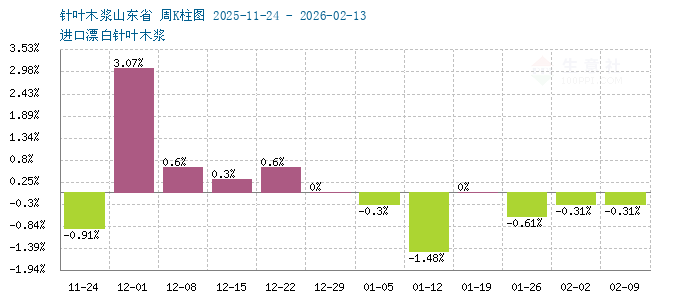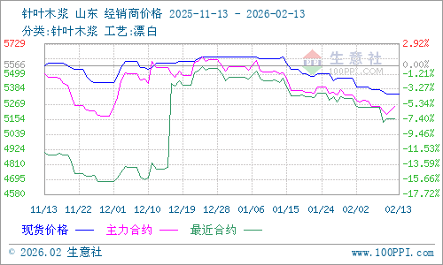 据生意社商品行情分析系统监测:本周针叶浆价格略有下探,阔叶浆价格平稳运行。2026年2月13日针叶木浆山东地区市场均价为5350元/吨,与2月8日均价相比下降了0.62%。2月13日阔叶木浆山东地区市场均价为4600元/吨,与2月8日均价相比保持平稳。