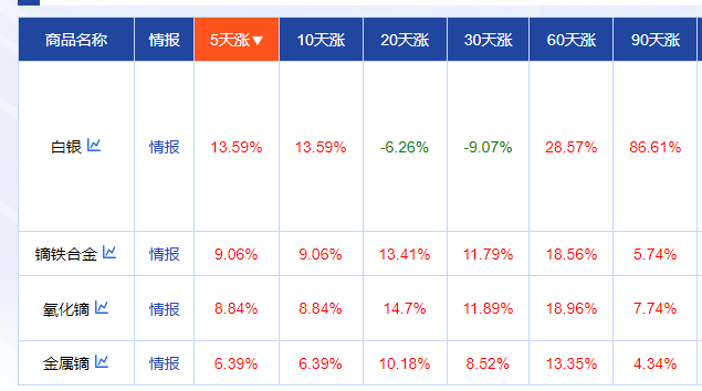 据生意社股票通显示,节后大宗商品市场中白银、镝铁合金、氧化镝、金属镝4个产品涨势突出,涨幅均超5%,其中重稀土相关品类价格的显著上行,进一步点燃了市场对2026年一季度稀土产业的业绩预期。