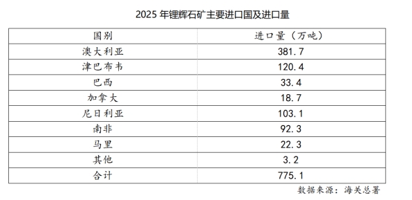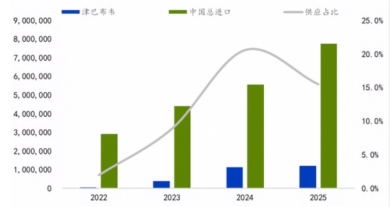 津巴布韦作为非洲锂矿资源的核心产区,是非洲第一大锂矿出口国。2025年,该国锂精矿产量折合15万吨碳酸锂当量(LCE),占全球锂供应量的12%,其中90%以上的出口量流向中国,是中国第二大锂精矿进口来源国,仅次于澳大利亚,2025年中国累计进口锂精矿775.1万吨,其中从津巴布韦进口120.4万吨,占比达15.5%。