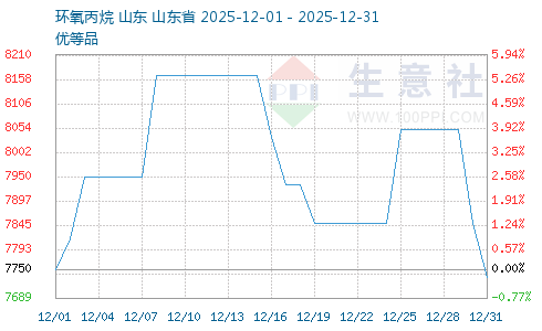 2025年12月国内环氧丙烷市场呈现“震荡上行后回调再反弹”的走势。据生意社监测系统显示,截止12月31日,生意社环氧丙烷基准价为7733.33元/吨,与12月1日相比,下降了0.22%。市场核心矛盾集中于新增产能释放与老旧装置淘汰的供应博弈,叠加原料丙烯价格波动及下游需求疲软的双重制约,价格呈现阶段性特征。