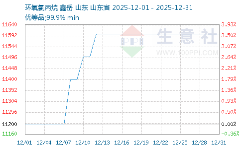 12月市场触底后转为震荡上行。中下旬,行业开工负荷有限,叠加部分主流厂家预售订单较多,现货供应压力不大。在成本支撑与供需改善双重作用下,市场挺价意愿增强,行情企稳。据生意社监测分析系统显示,截至12月31日,生意社环氧氯丙烷基准价为11600元/吨,与本月初相比,上涨了3.57%。