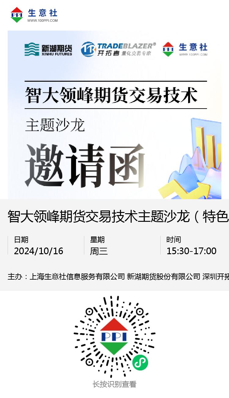 本次活动,旨在为学员提供深入且实用的期货交易知识与技术。通过专业的教学和实战案例分析,帮助学员掌握实用的特色指标和技术工具,培养敏锐的市场洞察力,能够快速捕捉市场趋势,先人一步发现潜在的交易机会。系统的培训课程和手把手教学实战演练,让你的交易技能迅速提升。互动交流环节,思想的火花将在这里碰撞。你可以提出自己的疑惑,分享自己的经验,与专家和其他学员共同探讨期货交易的奥秘。让我们携手共进,在智大领峰期货交易技术主题沙龙中,开启属于自己的期货交易成功之旅。