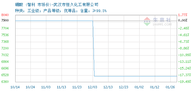 | 种类:工业级;产品等级:优等品;含量:≥99.5% 附加说明:【 大宗原料价格波动较快,价格随行就市,实单致电:157-9198-4079 】 硼酸 |