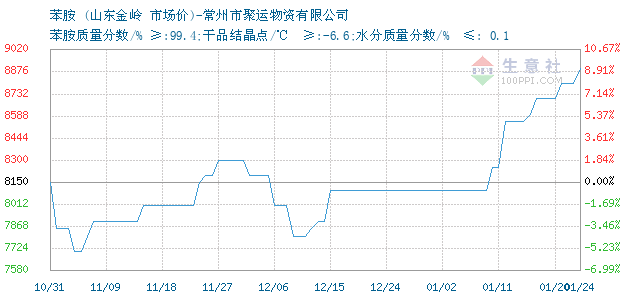 | 苯胺质量分数/% ≥:99.4;干品结晶点/℃ ≥:-6.6;水分质量分数/% ≤: 0.1 附加说明: |
