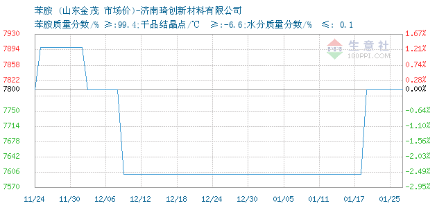 | 苯胺质量分数/% ≥:99.4;干品结晶点/℃ ≥:-6.6;水分质量分数/% ≤: 0.1 附加说明: |