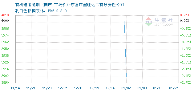 | 乳白色粘稠液体,Ph6.0-8.0 附加说明:东营市鑫旺化工,有机硅消泡剂报价3900元/吨。化工产品价格变动频繁,详情欢迎来电咨询! |