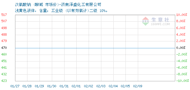 | 属性规格 | 浅黄色液体,含量:工业级 (以有效氯计)二级 10%。 | ||