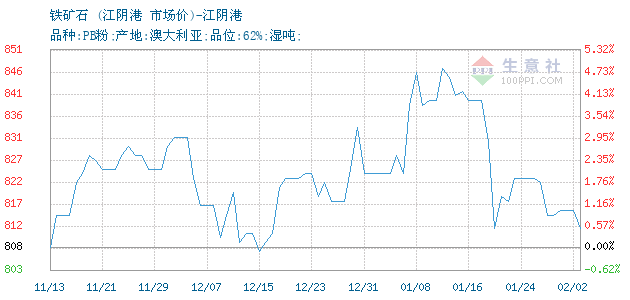 | 属性规格 | 品种:PB粉;产地:澳大利亚;品位:62%;湿吨; | ||