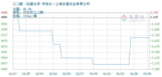 | 属性规格 | 含量:99.9% 规格:涤纶级乙二醇 包装:220kg/桶 | ||