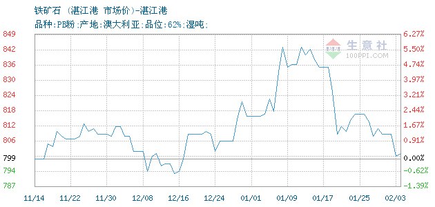 | 属性规格 | 品种:PB粉;产地:澳大利亚;品位:62%;湿吨; | ||