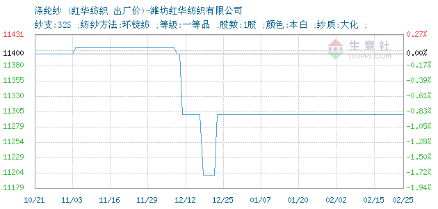 | 纱支:32S ;纺纱方法:环锭纺 ;等级:一等品 ;股数:1股 ;颜色:本白 ;纱质:大化 ; 附加说明: |