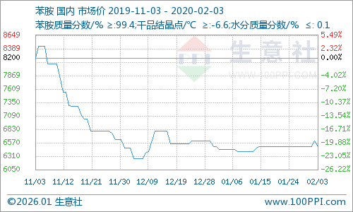 2月3日,山东地区苯胺价格在6400元/吨;南京地区苯胺价格6800元/吨。
